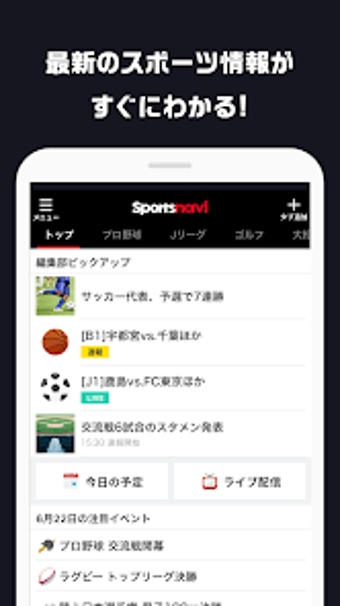 The app, titled スポーツナビ野球サッカーゴルフなど速報ニュースが満載, is a free sports news application available on Android. It serves as a one-stop platform for sports enthusiasts, providing real-time updates, match schedules, results, and rankings across various sports including baseball, soccer, golf, and more. Users can customize their experience by adding favorite sports tabs and follow specific teams or players to receive tailored notifications about upcoming events and breaking news.
